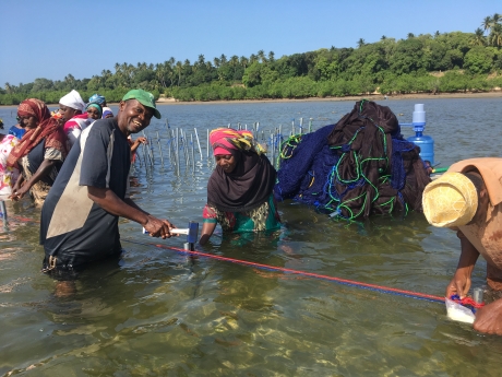 A fin de ayudar a las comunidades locales a aprovechar esta oportunidad, la FAO proporcionó apoyo técnico e impartió un curso de capacitación en acuicultura y tecnología del cultivo a través del Criadero Marino de Zanzíbar. Durante tres días, 60 productores de algas marinas, en su mayoría mujeres con profundos conocimientos locales de la vida marina y experiencia de trabajo en el océano, participaron en la formación que impartió la FAO en una bahía de la costa este de Zanzíbar. Los aprendices no dudaron en meterse en el agua para aprender mediante sesiones prácticas la forma de montar corrales para los pepinos de mar a fin de velar por que los juveniles se desarrollaran en condiciones óptimas.