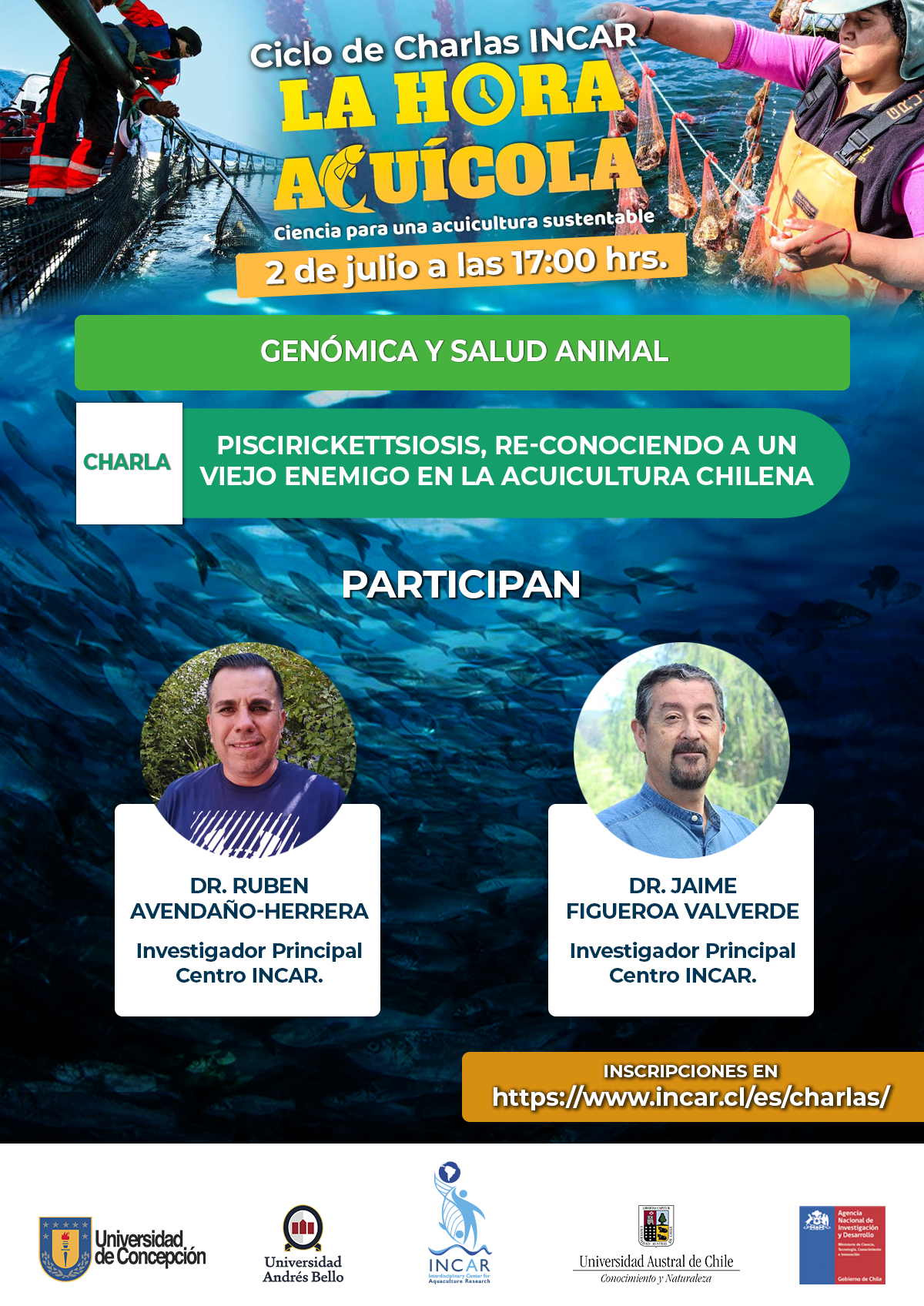 Este jueves 02 de julio, el Ciclo de Charlas INCAR, “La Hora Acuícola”, abordará en una nueva sesión virtual la Piscirickettsiosis, enfermedad que afecta la industria salmonera nacional.