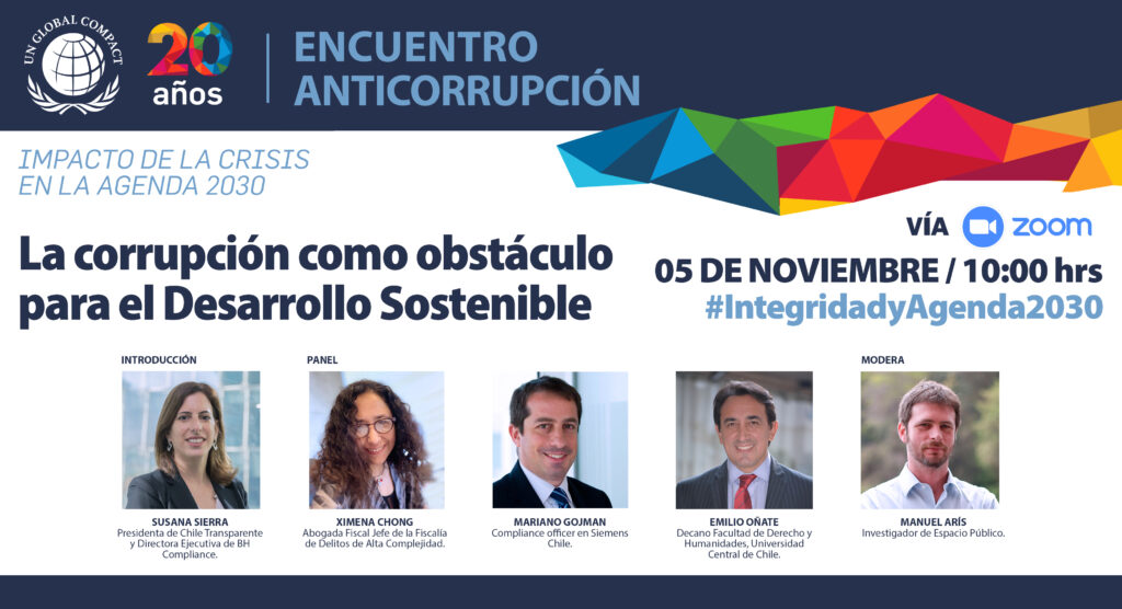 En medio de este escenario, Pacto Global Chile, organizó el Encuentro Anticorrupción denominado: “La corrupción como obstáculo para el Desarrollo Sostenible”. La exposición principal estará a cargo de Susana Sierra, presidenta de Chile Transparente, directora ejecutiva de BH Compliance; seguido de un panel de expertos compuesto por Ximena Chong, abogada Fiscal Jefe de Delitos de Alta Complejidad; Mariano Gojman, Compliance officer, Siemens Chile y Emilio Oñate, decano Facultad de Derecho y Humanidades, Universidad Central de Chile. Manuel Arís, Investigador de Espacio Público será el moderador.