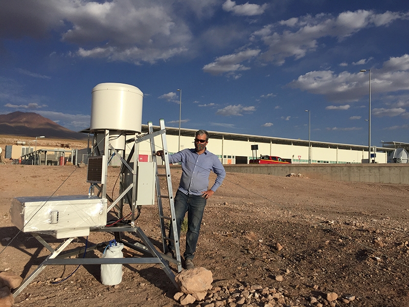 Las mediciones de este proyecto se están realizando en dependencias de ALMA (Atacama Large Millimeter/submillimeter Array), 50 kilómetros al este de San Pedro de Atacama, y en el complejo solar Cerro Dominador. “En cada lugar se instaló una estación meteorológica para medir dirección y velocidad del viento, temperatura, presión, humedad relativa y radiación solar, además de un colector de polvo llamado CARAGA, que mide los flujos de deposición de polvo. Las mediciones se estarán realizando por al menos un año, esperando que las condiciones de seguridad permitan el adecuado funcionamiento de los instrumentos”, dijo Huneeus.
