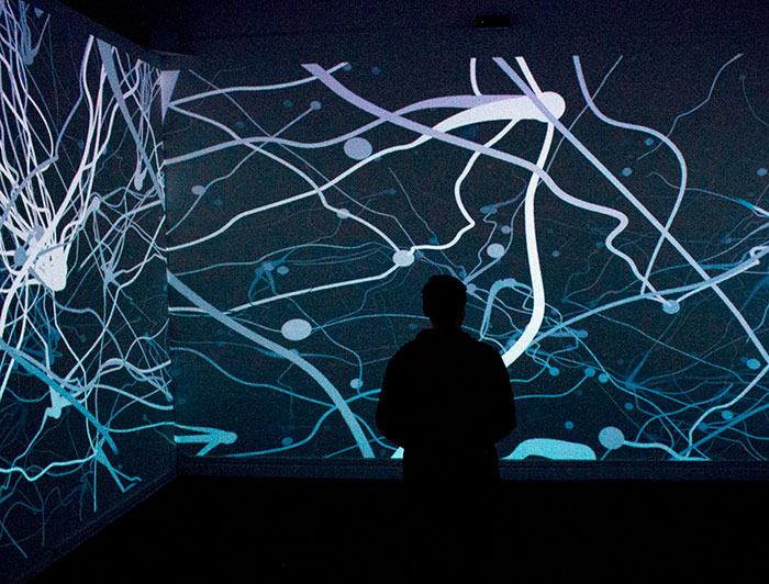 La exposición planteó algo muy innovador. “Era como entrar a un cerebro. Cuando la persona entraba a la sala, se enfrentaba a tres pantallas y era seguida por un sensor; en la medida que se movía, cambiaba la actividad cerebral -las imágenes y sonidos-. Pero si entraba otra persona, era considerada como un estímulo externo para el cerebro, y toda la actividad cesaba”, explica la académica.