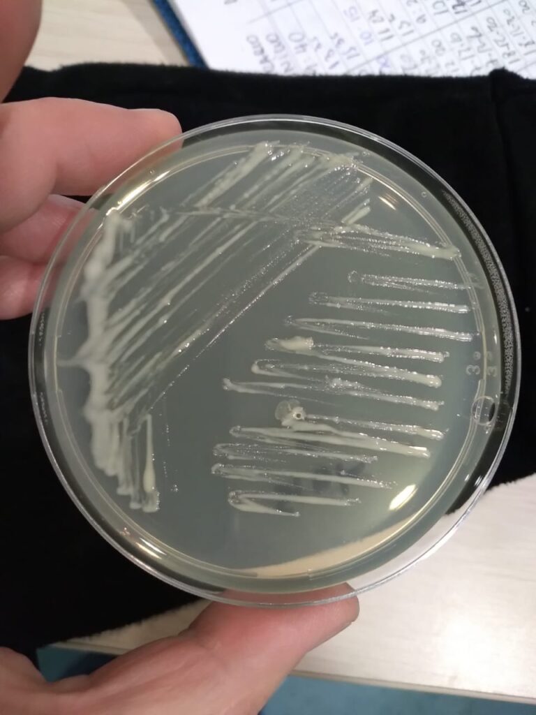 Cultivo de R. salmoninarum crecida en placa de agar KDM-2.