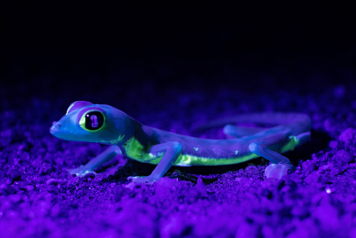 La fluorescencia inherente a este gecko de Namibia se produce cuando el animal entra en contacto con la luz que la Luna refleja del Sol. Es capaz de absorberla, para luego emitir una longitud de onda más larga a partir de secreciones químicas en su piel. Un pigmento específico sobre ésta, llena de cristales de guanina, es el que les permite brillar de esta manera.