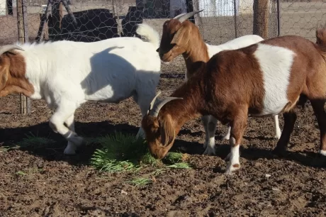 Las cabras de Agnes, de nuevo saludables y bien nutridas, se deleitan mordiscando el forraje obtenido mediante técnicas de producción hidropónica. Arriba a la izquierda: ©FAO/Phillipus Tobias. Abajo a la derecha: ©FAO/Phillipus Tobias