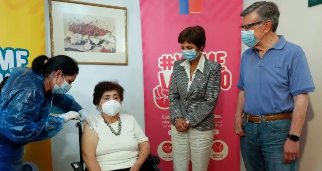 Hasta una residencia particular ubicada en la comuna de Las Condes llegó este miércoles la Subsecretaria de Salud Pública, Paula Daza, junto al alcalde de esa comuna, Joaquín Lavín, para acompañar la vacunación de Juana Pino de 74 años, mujer que tras un accidente vascular quedó en situación de postración, lo que le impide movilizarse hasta un centro de salud para recibir la vacuna contra COVID-19.