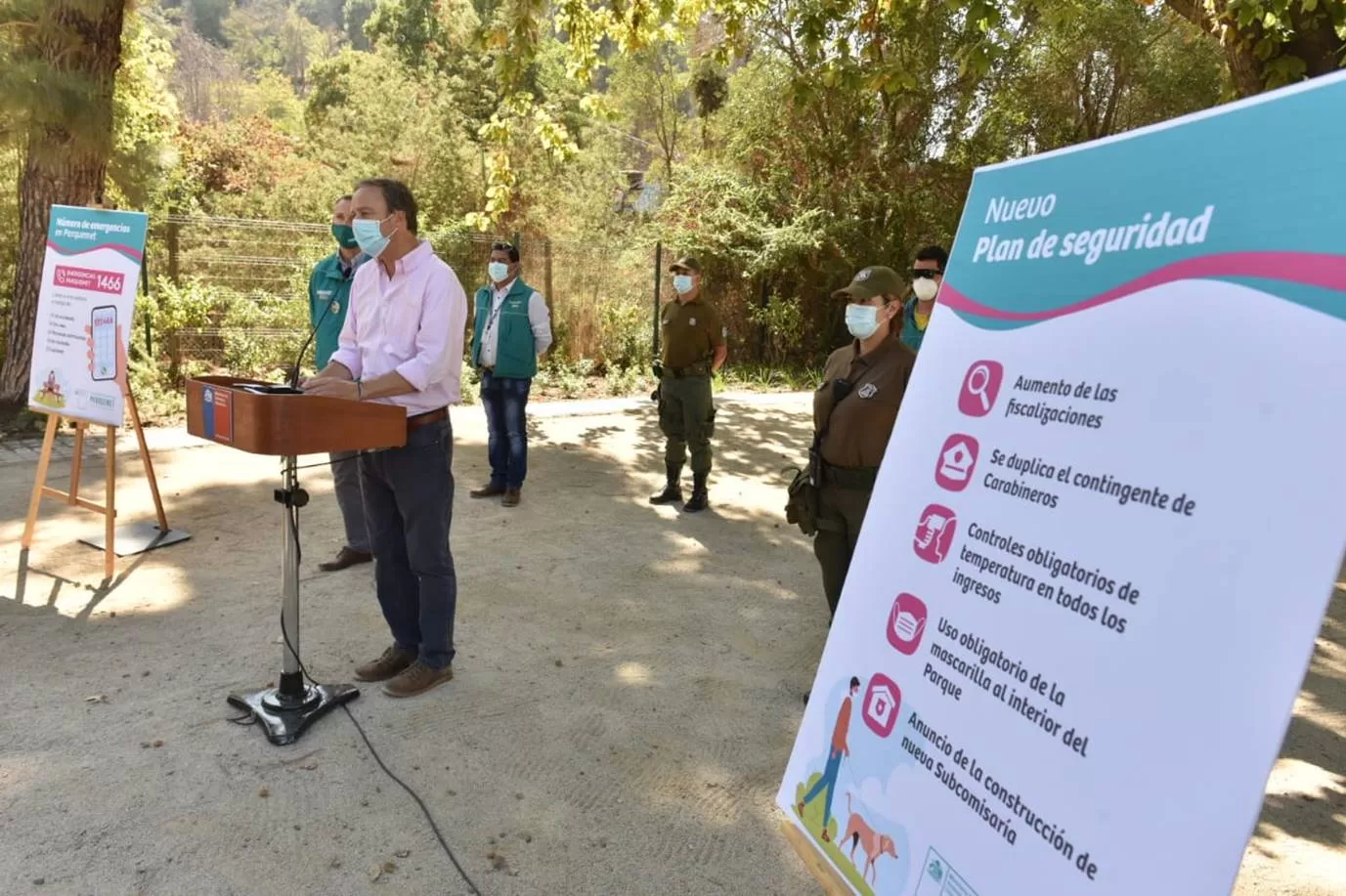 El Ministro de Vivienda y Urbanismo, Felipe Ward, junto al director de Parquemet, Martín Andrade, dieron a conocer esta tarde el nuevo plan de seguridad, a raíz del aumento de casos Covid 19, destacando el anuncio de la construcción de una nueva Subcomisaría, el aumento de dotación de personal de Carabineros para realizar más controles aleatorios y de resguardo del parque, aumento de guarda parques y un nuevo número de emergencia, el 1466, para la prevención de delitos y ayuda en situaciones de emergencia o alerta.