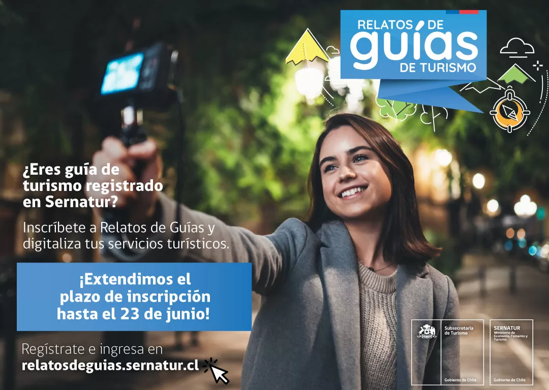 - Relatos de Guías permitirá que los profesionales registrados en Sernatur continúen desarrollando su trabajo, esta vez de manera virtual. El nuevo plazo para inscribirse vence el 23 de junio y se puede acceder desde relatosdeguias.sernatur.cl.
