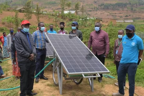 A través del Proyecto KnoWat (Conocer mejor el agua) la FAO instaló sistemas de riego alimentados por energía solar para aumentar la eficiencia del riego de los campos y apoyar los medios de vida de los agricultores de la zona. En el marco del proyecto, se entregaron tres bombas solares portátiles y accesorios a los agricultores de la Cooperativa de producción hortícola de Yanze. Fue la primera vez que se introdujeron sistemas de riego con energía solar en el distrito de Rulindo.