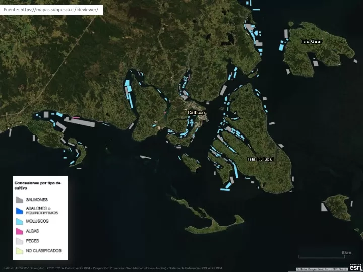 - Agrupaciones de concesiones de salmonicultura, ACS, en la región, considerando los aportes por la engorda de salmónidos y la extracción en el cultivo de choritos dentro de áreas marinas de uso intensivo tanto para el cultivo de salmón como de choritos.
