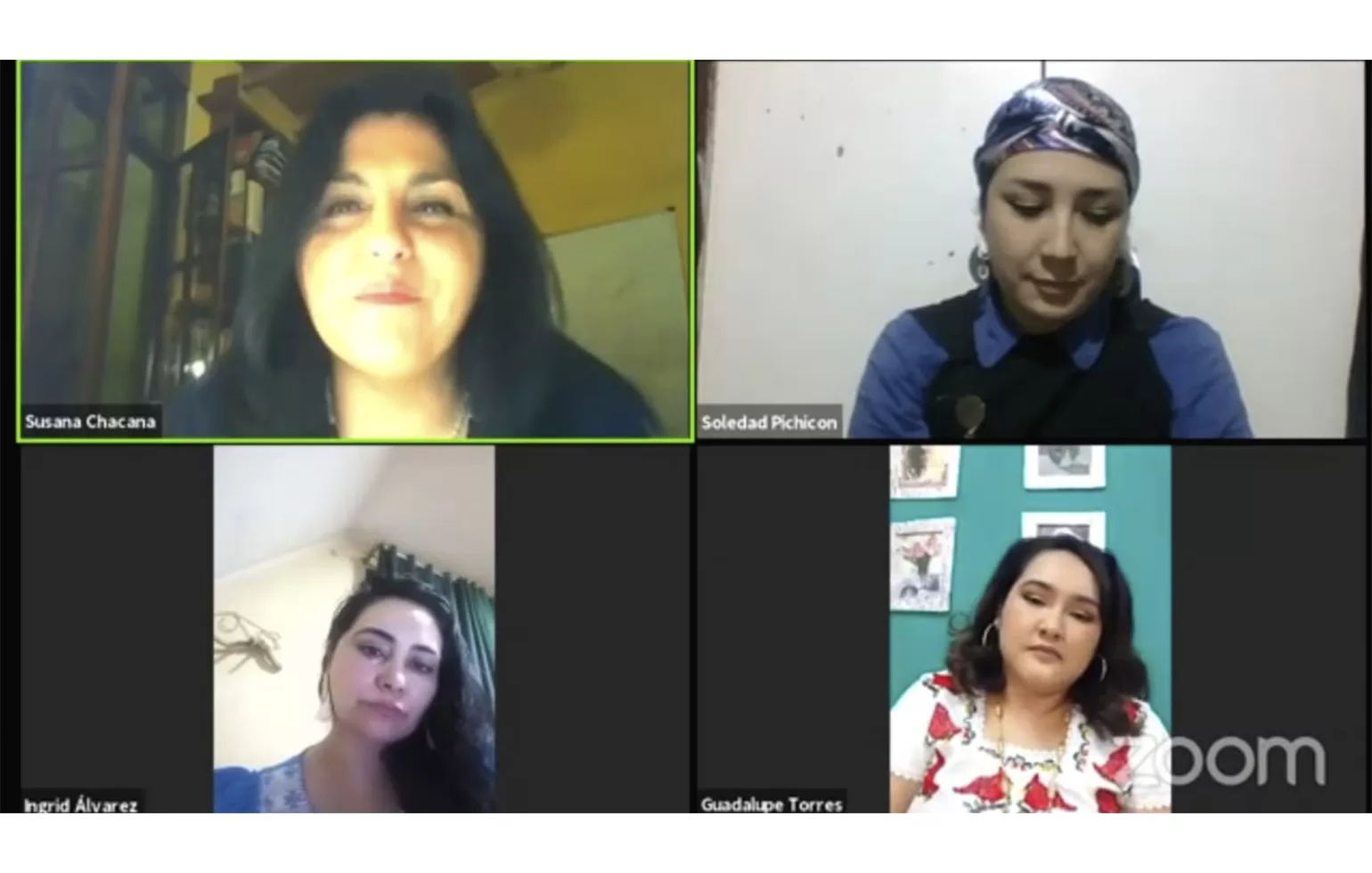 El conversatorio realizado a través de la plataforma zoom, contó con la presencia de las jóvenes textileras, Guadalupe Torres, bordadora mexicana, oriunda de Tabasco y que actualmente reside en Yucatán-Mérida, y de Soledad Pichicon, textilera mapuche, nacida en Santiago residente de la comuna de Nueva Imperial en la región de La Araucanía.
