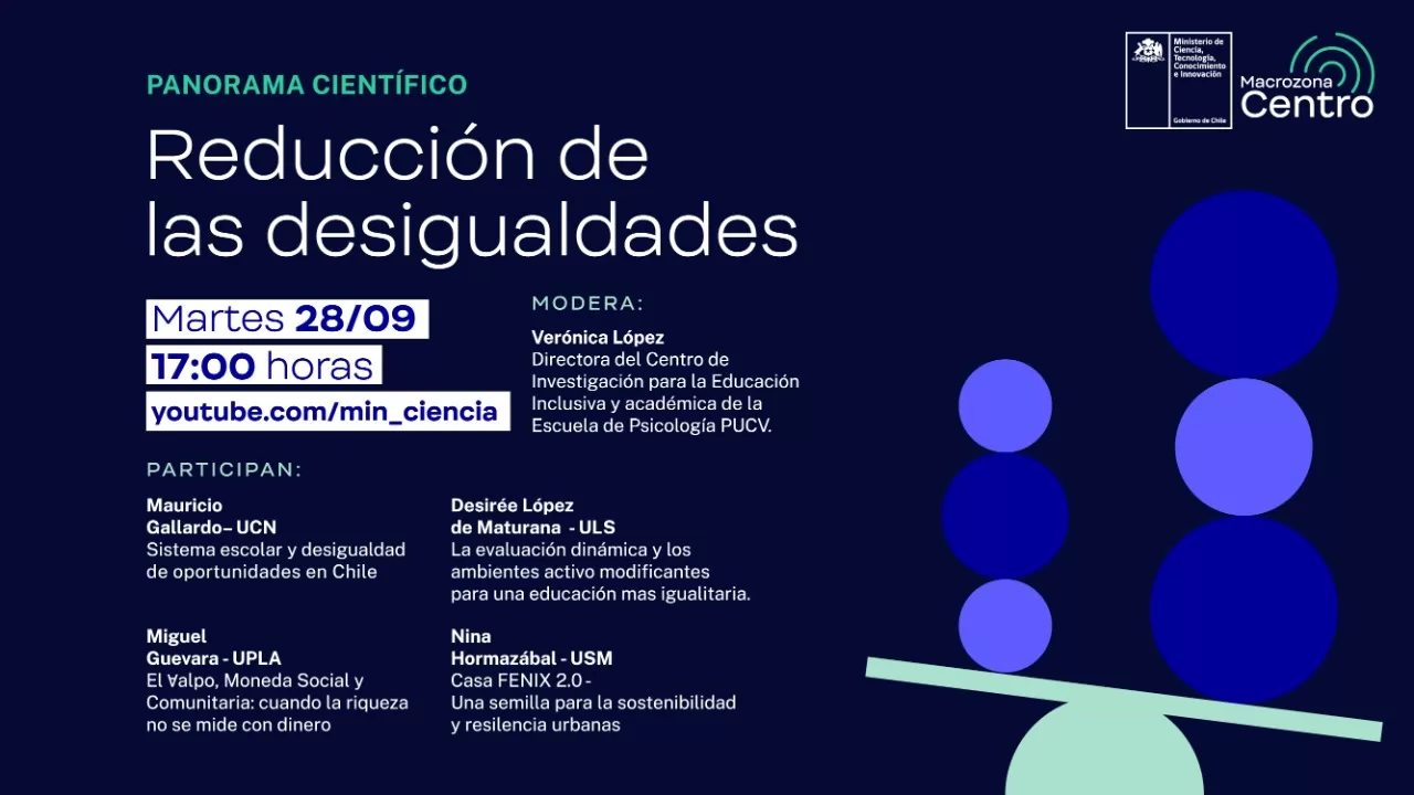 Las ciencias sociales y las humanidades serán las protagonistas del ya tradicional Panorama Científico, organizado por la Seremi de Ciencias de la Macrozona centro. Esta vez se enfrentará el tema de la reducción de desigualdades, un tema amplio y diverso, que en esta oportunidad profundizará especialmente las desigualdades en torno a temas de educación, sin olvidar otras miradas como el acceso a vivienda o la importancia de la cohesión comunitaria.