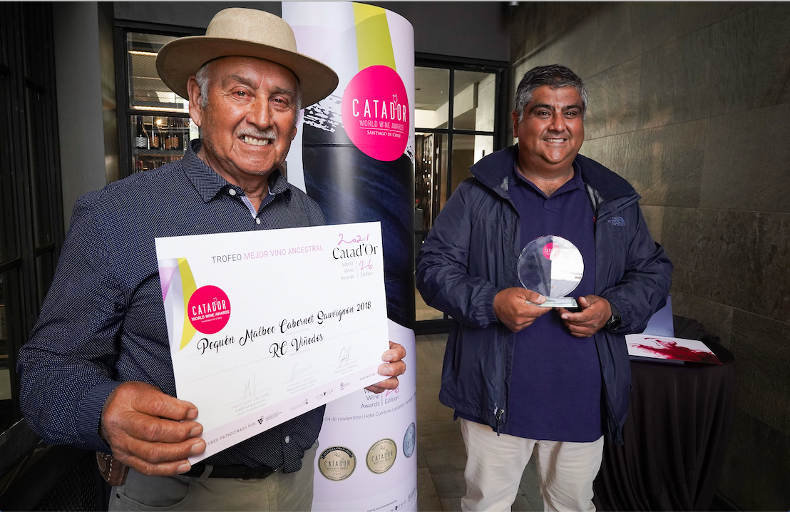 “Nuestras parras tienen 120 años y están tocadas por la mano de Dios, por eso nos dan tremendos vinos”, dice con orgullo René Aquiles Cabello Hidalgo (80), pequeño productor vitivinícola de Santa Cruz, quien junto a su hijo René Enrique Cabello Contreras (41), ingeniero agrícola, recibió el premio al Mejor Vino Ancestral Campesino y medalla de Gran Oro por su Pequén 2018, un ensamblaje de malbec y cabernet sauvignon, en el concurso internacional Catad’Or Wine Awards 2021 realizado entre el 2 y el 4 de este mes en el Hotel Cumbres Lastarria.