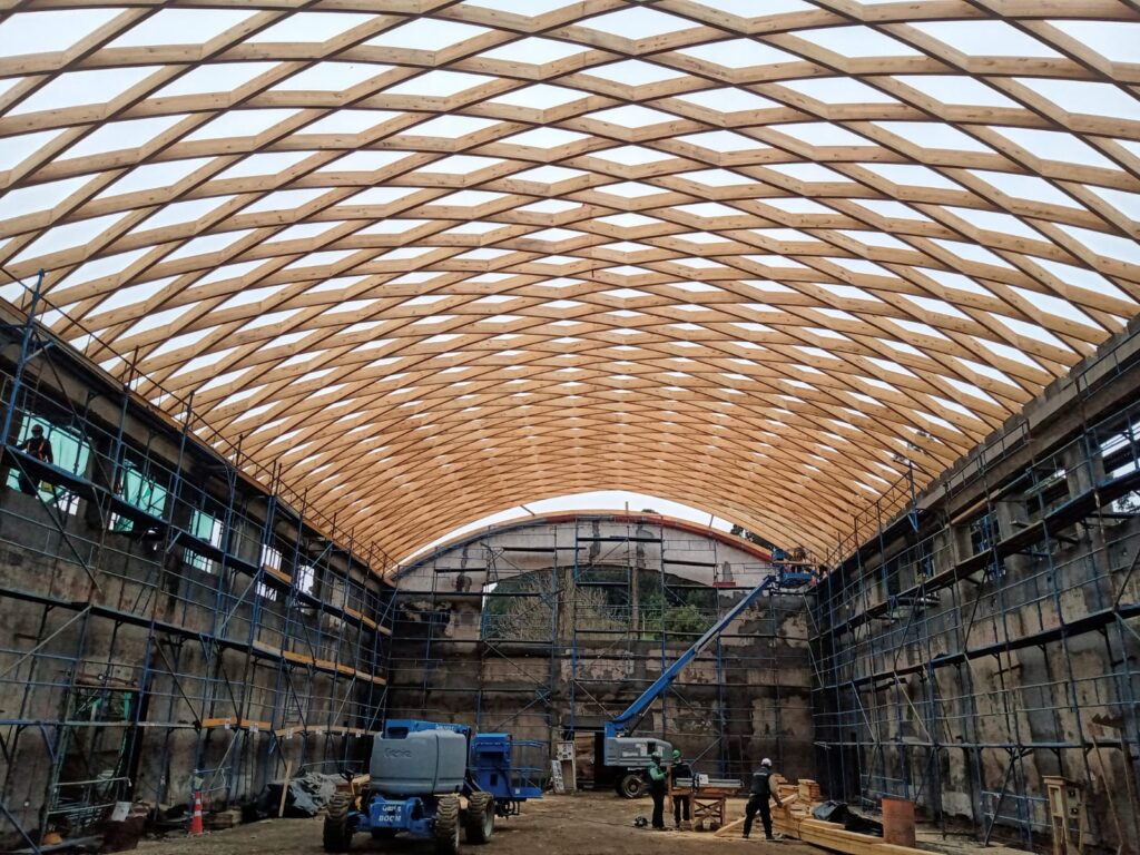 “En términos de arquitectura, sistema estructural y dimensiones se respeta la historia del gimnasio. La variación es que el material que se está utilizando es madera laminada de pino radiata. Como la estructura es curva, lo que se hizo fue que las piezas se fabricaron con una curvatura que permitiera que el gimnasio no se viera facetado en la parte de la techumbre sino que se viera una continuidad de la curvatura del mismo”, dijo Ernesto Hernández.