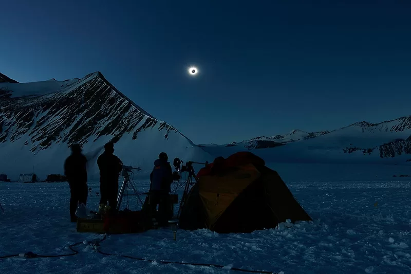 Los académicos Patricio Rojo, director del Departamento de Astronomía, junto a la estudiante de doctorado, Nitya Pandey, y al profesor del Departamento de Geofísica e investigador del Centro de Ciencia del Clima y la Resiliencia (CR)2, Rene Garreaud, fueron testigos del fenómeno desde el Campamento Glaciar Unión, la base chilena más cercana al Polo Sur. En la ocasión, los investigadores realizaron una serie de mediciones y registros para estudiar la corona solar, recolectar información sobre la actividad magnética del sol, y determinar la respuesta atmosférica frente al eclipse en esta zona.