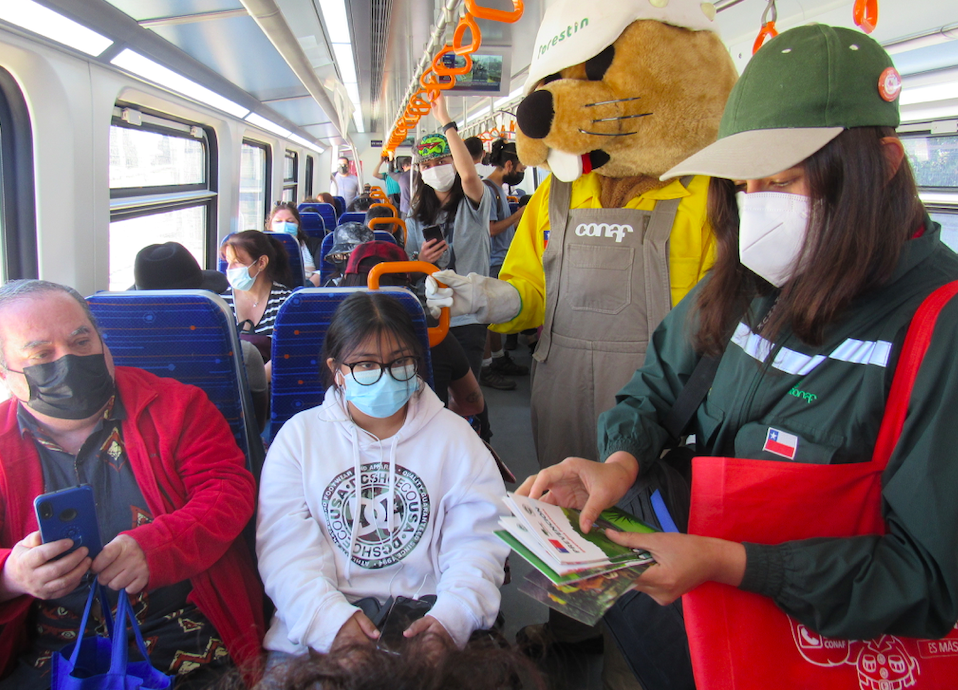 Concepción, viernes 21 de enero 2022.- El equipo preventivo de La Corporación Nacional Forestal (CONAF) junto a funcionarios de EFE Sur, realizaron un operativo para entregar recomendaciones preventivas a los pasajeros que viajan en el tramo Coronel-Concepción, de modo de evitar incendios forestales y accidentes ferroviarios.