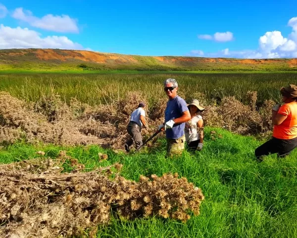 En esta línea, el control de especies invasoras en el humedal Rano Raraku fue una de las actividades claves de la semana de los humedales. Este humedal es el más afectado en la actualidad en la isla por la disminución sostenida de las precipitaciones, como por otros factores. Los incendios forestales han hecho que proliferen por toda la isla diversas plantas invasoras, que han reemplazado y desplazado a las plantas nativas, incluyendo las de los humedales. La extracción periódica de especies invasoras es una medida necesaria para que estas plantas no terminen por invadir por completo estos espacios, y en ese sentido la coordinación público-privada y el apoyo de los voluntarios de la comunidad cumplen un papel importante.