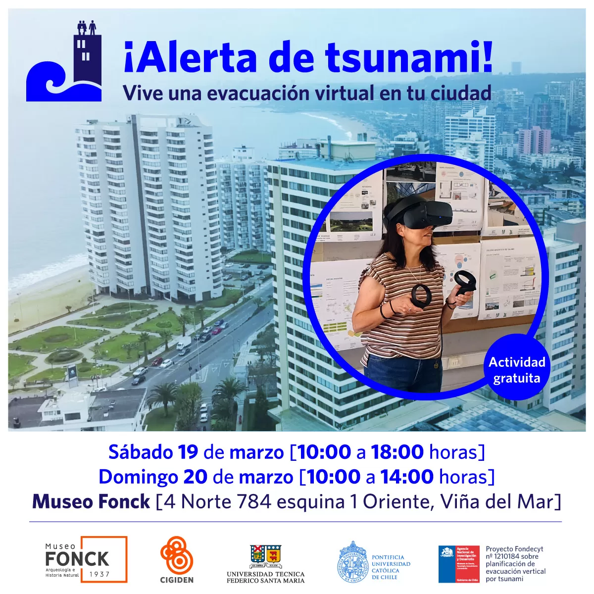 Por esa razón, para poder evaluar específicamente las capacidades de orientación espacial y la toma decisiones de las personas, durante una potencial evacuación por tsunami en Chile, el equipo de expertos CIGIDEN – USM, realizará el sábado 19 de marzo (de 10.00 a 18.00) y domingo 20 de marzo (de 10.00 a 14.00) en el frontis del Museo Fonck de Viña del Mar, una jornada de evacuación virtual para residentes y turistas de la Región de Valparaíso, específicamente del área inundable de la población Vergara de Viña del Mar.