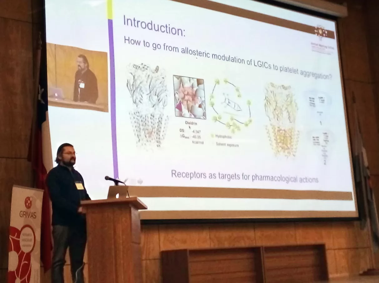 El Dr. Burgos, por su parte, realizó la exposición titulada «Identification of drugs and small molecules by SBVS for modulation of platelet aggregation». “El objetivo era mostrar la utilidad del uso de predicciones bioinformáticas para identificar moléculas dirigidas hacia proteínas blanco expresadas en la membrana plasmática de las plaquetas, en este caso el receptor de adenosina A2A, las cuales fueron evaluadas funcionalmente para confirmar el efecto que producían sobre la agregación plaquetaria, logrando confirmar que actúan como inhibidores de este evento clave en la hemostasis primaria. Para esto fue esencial la colaboración con el Dr. Marcelo Alarcón de la Universidad de Talca”, comentó el investigador.