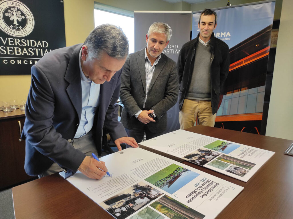 Con este fin se firmó un convenio en las dependencias de la Universidad San Sebastián donde participaron el vicerrector de esa casa de estudios, Jorge Sabag; el gerente regional de Corma, Fernando Illanes; el director del área Maderas de Corma, Rodrigo Inostroza, y representantes del área Vinculación con el Medio de la casa de estudios.