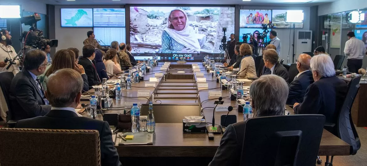 Durante una conferencia de prensa con el ministro de relaciones exteriores, Bilawal Bhutto Zardari, Guterres recordó que algunas regiones de Pakistán acaban de experimentar el agosto más lluvioso del que se tiene constancia y que las precipitaciones en algunas provincias han sido hasta ocho veces superiores a las habituales.