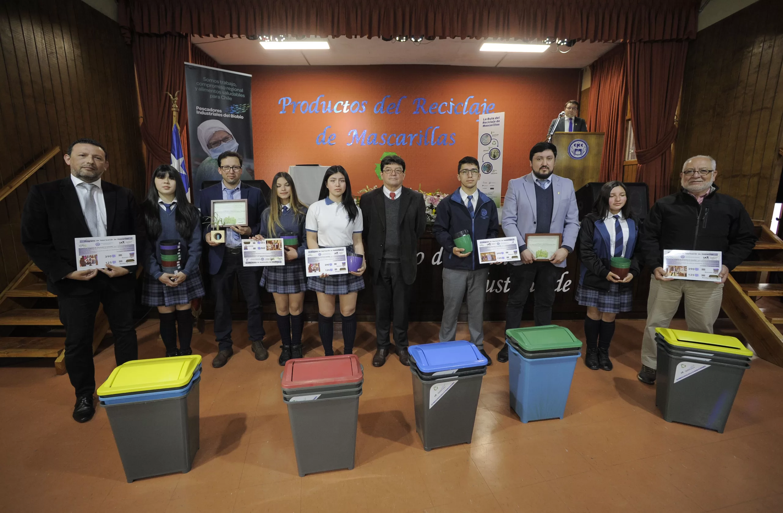 En el Liceo Bicentenario Industrial de Tomé se entregaron productos elaborados a partir del reciclaje de mascarillas desechables, una de las iniciativas más notables de economía circular impulsadas desde la Región del Biobío, que nació como piloto en julio de 2020 coordinando los esfuerzos de los Ministerios de Medio Ambiente y Ciencias, los Pescadores Industriales y la UDT.