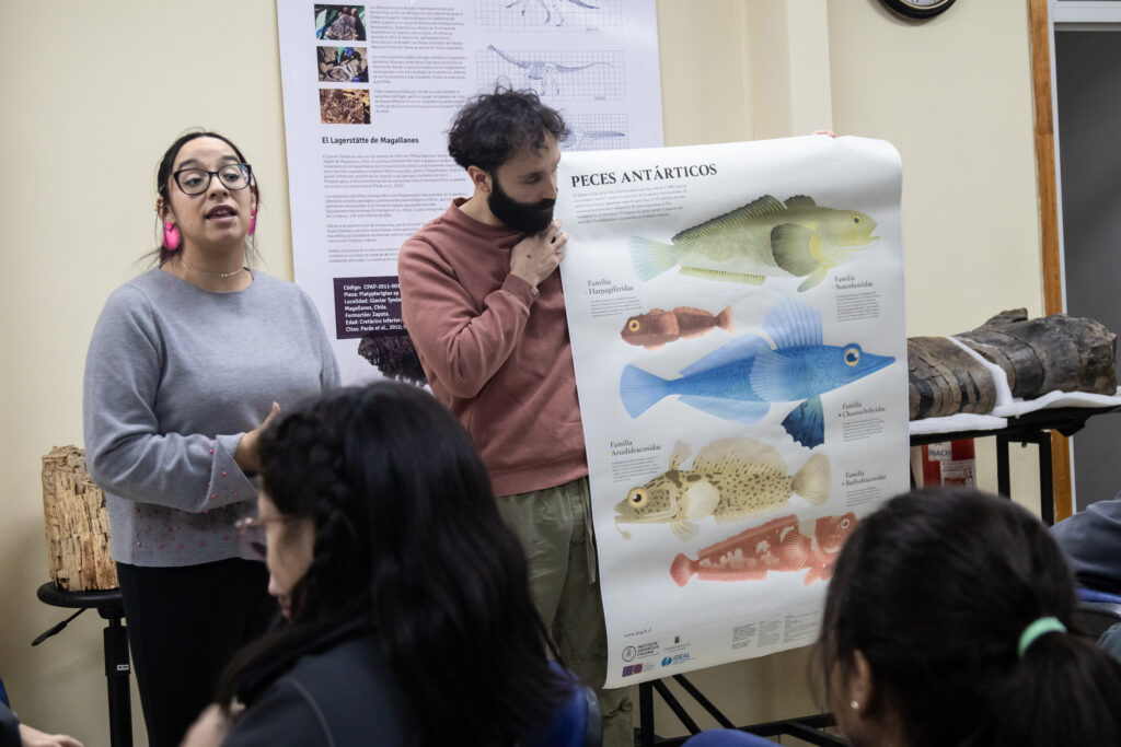 La actividad de Valdivia estuvo a cargo de la Dra. Julia Saravia y la Dra. Valentina Bernal, investigadoras del Instituto Milenio BASE y del Laboratorio de Genómica y Ecología Molecular Antártica y subantártica (LAGEMAS) de la Universidad Austral de Chile (UACh). Ellas compartieron conocimientos sobre los peces antárticos y realizaron actividades interactivas junto a los estudiantes. Ambas investigadoras trabajaron junto al equipo de INACH como contraparte científica de la lámina de peces.