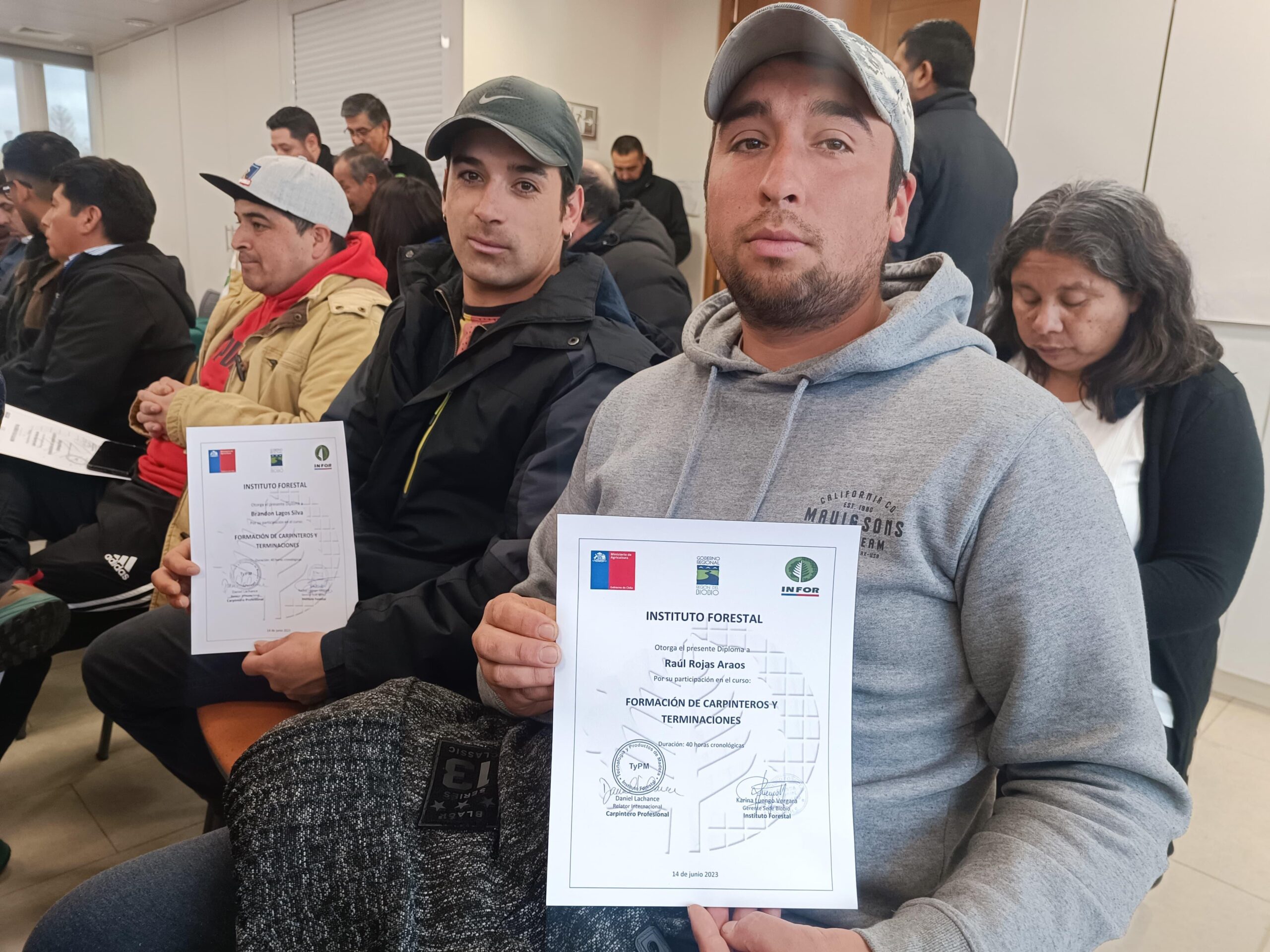 El Instituto Forestal (INFOR) llevó a cabo la ceremonia de clausura de tres cursos de formación de carpinteros en los cuales 34 personas de Los Álamos y Lebu fueron capacitadas y adquirieron nuevos conocimientos para ampliar el enfoque de construcción en madera en el marco del programa “Capacitación para la competitividad de la pyme forestal maderera y la construcción con madera en el Biobío” del Fondo Nacional de Desarrollo Regional (FNDR).