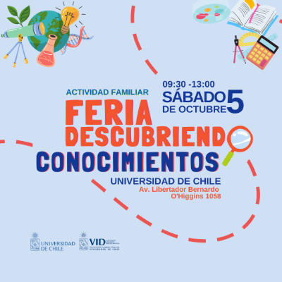 Buscando dar a conocer la diversidad de conocimientos generados por académicos/as e investigadores/as de la Universidad de Chile a niños, niñas y jóvenes, la Vicerrectoría de Investigación y Desarrollo de la Universidad de Chile, llevará a cabo la “Feria Descubriendo Conocimientos”. La actividad se realizará el próximo sábado 5 de octubre, en el patio Andrés Bello de la Casa Central de la Universidad, desde las 9:30 hasta las 13:00 horas.