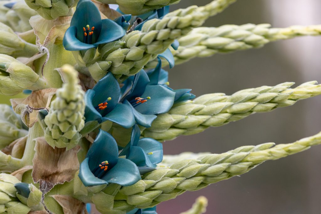 El primero de los escapos -las varas que sostienen sus inflorescencias espigadas – asomó en octubre y ya presenta las primeras flores aceradas de color azul turquesa que caracterizan a esta planta.