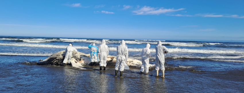 Desde Sernapesca se coordinó para el domingo el traslado de científicos expertos de la Universidad Austral de Chile y Universidad San Sebastián, encabezados por el Dr. Luis Miguel Flores, quienes realizaron la necropsia correspondiente y tomaron numerosas muestras para estudios posteriores.