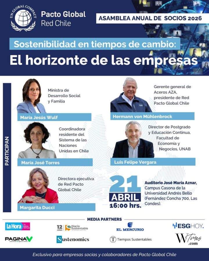 Con la participación de destacadas autoridades y líderes de las más de 220 empresas socias de la red, Pacto Global Chile realizará su Asamblea Anual de Socios 2026, un espacio de encuentro que abordará los principales desafíos del sector privado en un contexto global donde la única constante es el cambio y la sostenibilidad se transforma en un ancla de resiliencia.